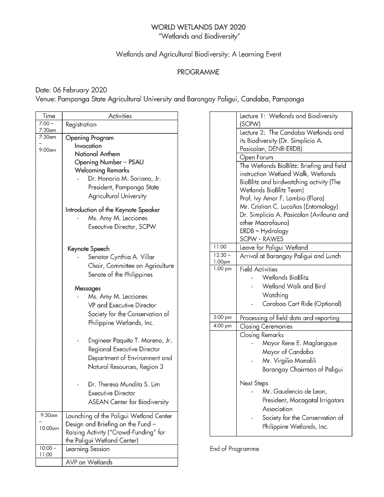 The programme for the SCPW World Wetlands Day Celebration is found below: