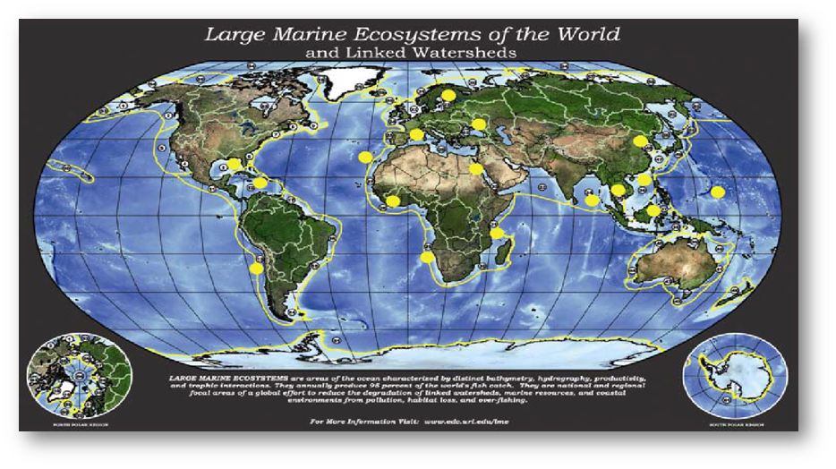 LMEs are regions of ocean space of 200,000 km² or greater, that encompass coastal areas from river basins and estuaries to the outer margins of a continental shelf or the seaward extent of a predominant coastal current. Defined by ecological criteria, including bathymetry, hydrography, productivity, and trophically-linked populations (Duda and Sherman 2002)